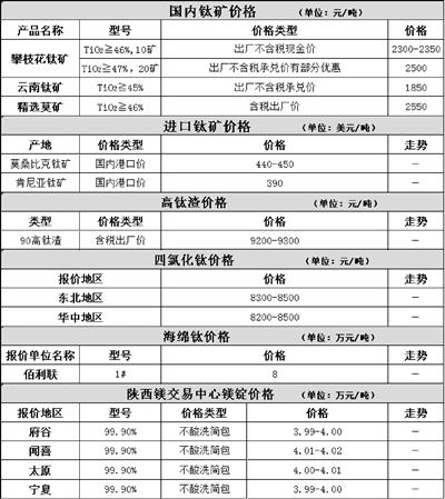 受原輔料價(jià)格影響,四氯化鈦價(jià)格小幅上調(diào),漲幅在300元~500元/噸。
